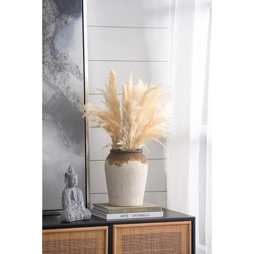 Enhance your living space with this stunning 10-inch ivory and brown ceramic round jug vase. Designed in a charming jug vase type, its round shape adds a touch of uniqueness to your decor. The purposeful distressing is achieved through coat/paint distressing, giving it a rustic bohemian charm. Hand-painted with intricate details, this vase exudes artistic elegance. Crafted from high-quality ceramic in a captivating brown hue, it seamlessly blends into any room decor. Perfect for displaying fresh blooms or as a standalone decorative piece, this vase is a versatile accent for your home. 9.8-inch h x 18.5-inch w x 7.1-inch d.