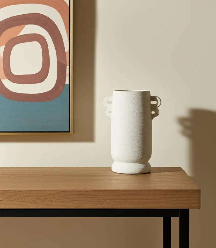• 10" Off White Ceramic Cylinder Table Vase With Handles