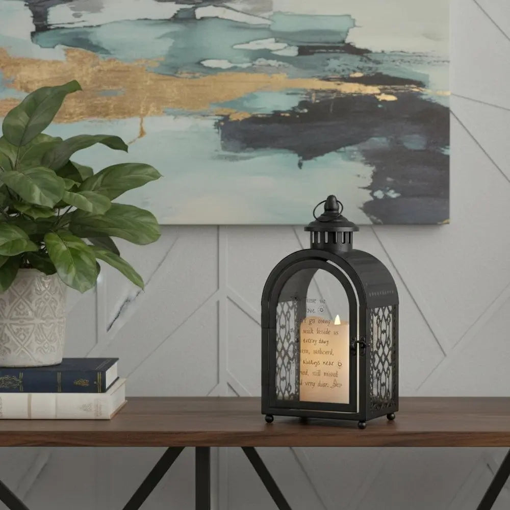 This 11-inch clear and black glass and metal memorial remembrance lantern candle holder is a perfect way to love and remember those that have passed. The front glass panel is emblazoned with a heartfelt message, and comes complete with a 3-inch LED candle. This candleholder is the perfect way to express your condolences in the form of a gift, or use to decorate your space in remembrance of your loved ones. 11.20-inch h x 5.50-inch w x 4.50-inch d.