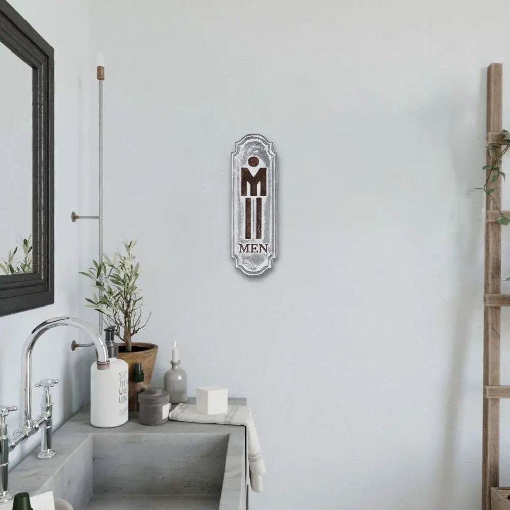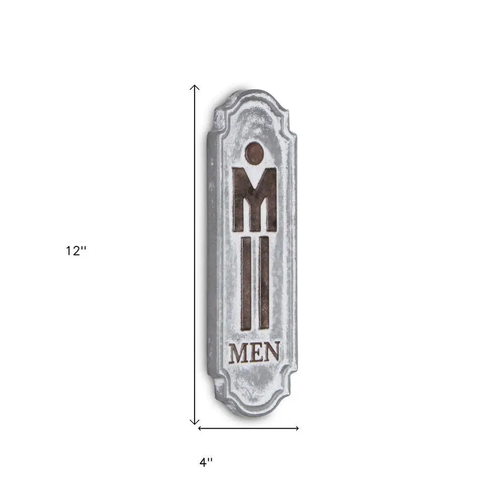 The 12-inch x 4-inch gray metal men's room wall decor is the perfect way to mark your bathroom. Add outside the door to your bathroom to add a rustic and decorative touch. Hangs vertically to advertise the preferred sex for the particular washroom. 12-inch H x 4-inch W x 0.5-inch D