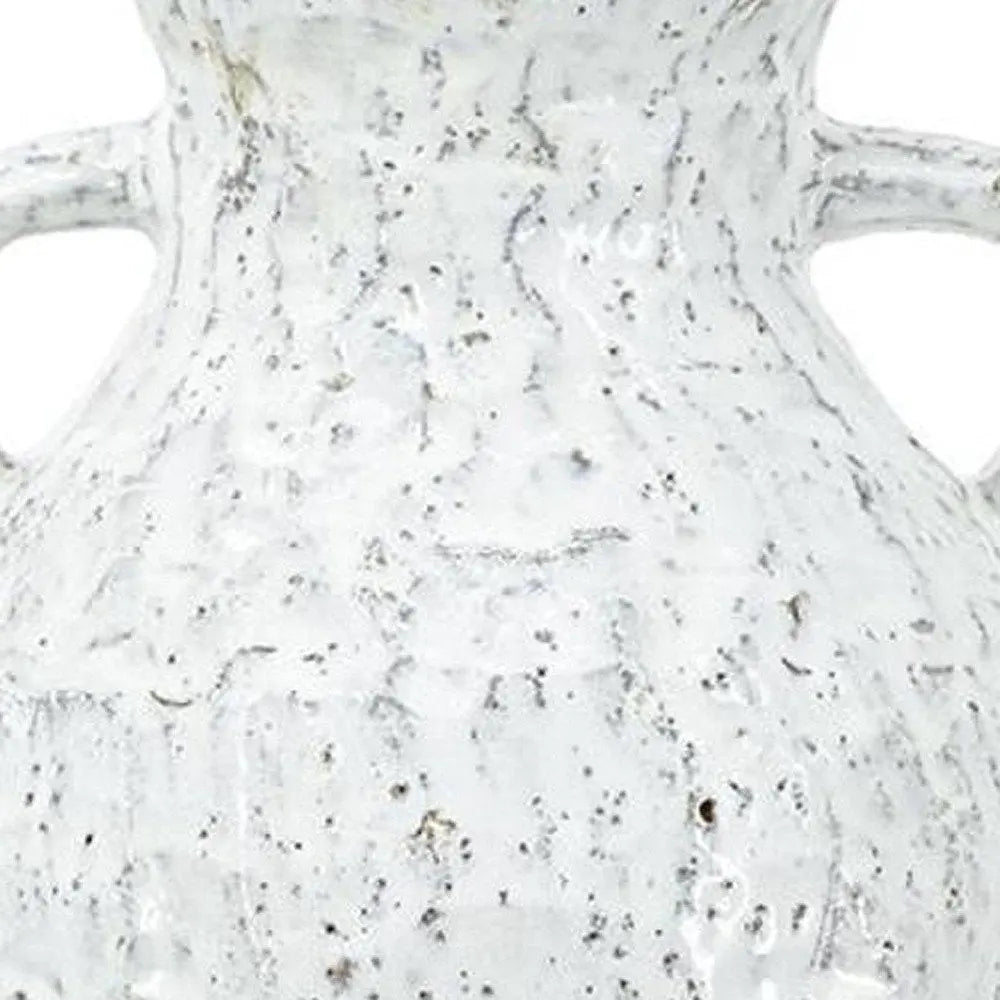 The 14-inch beige and ivory color block amphora terracotta table vase is a stunning addition to your home decor. Crafted from durable terracotta, this vase showcases a unique amphora shape that enhances any table setting. Hand painted with meticulous care, this piece is heavily distressed to add character and charm. With its elegant color block design, this vase showcases natural beige clay and an ivory off white reactive glaze. Perfect for displaying your favorite floral arrangements or standing alone as a decorative piece, it serves as a an earthy and artisanal focal point in any room. 13.8-inch h x 7.9-inch w x 7.9-inch d.