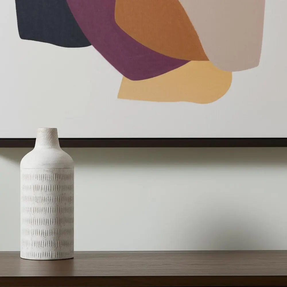 The 14-inch off white and natural cylinder metal table vase makes a stunning centerpiece for any tabletop arrangement. This artisanal table vase is crafted from durable metal with a rustic distressed finish, geometric pattern and speckles that give it a unique character. Designed to be watertight, this vase is perfect for showcasing your favorite blooms without worry. Its versatile design allows it to fit seamlessly into various spaces, enhancing both casual and formal settings. Add this stunning piece to your collection and transform your living environment with sophistication. Elevate your home decor with this stylish table vase that combines functionality and artistic design. 14.17-inch h x 5.91-inch w x 5.91-inch d.