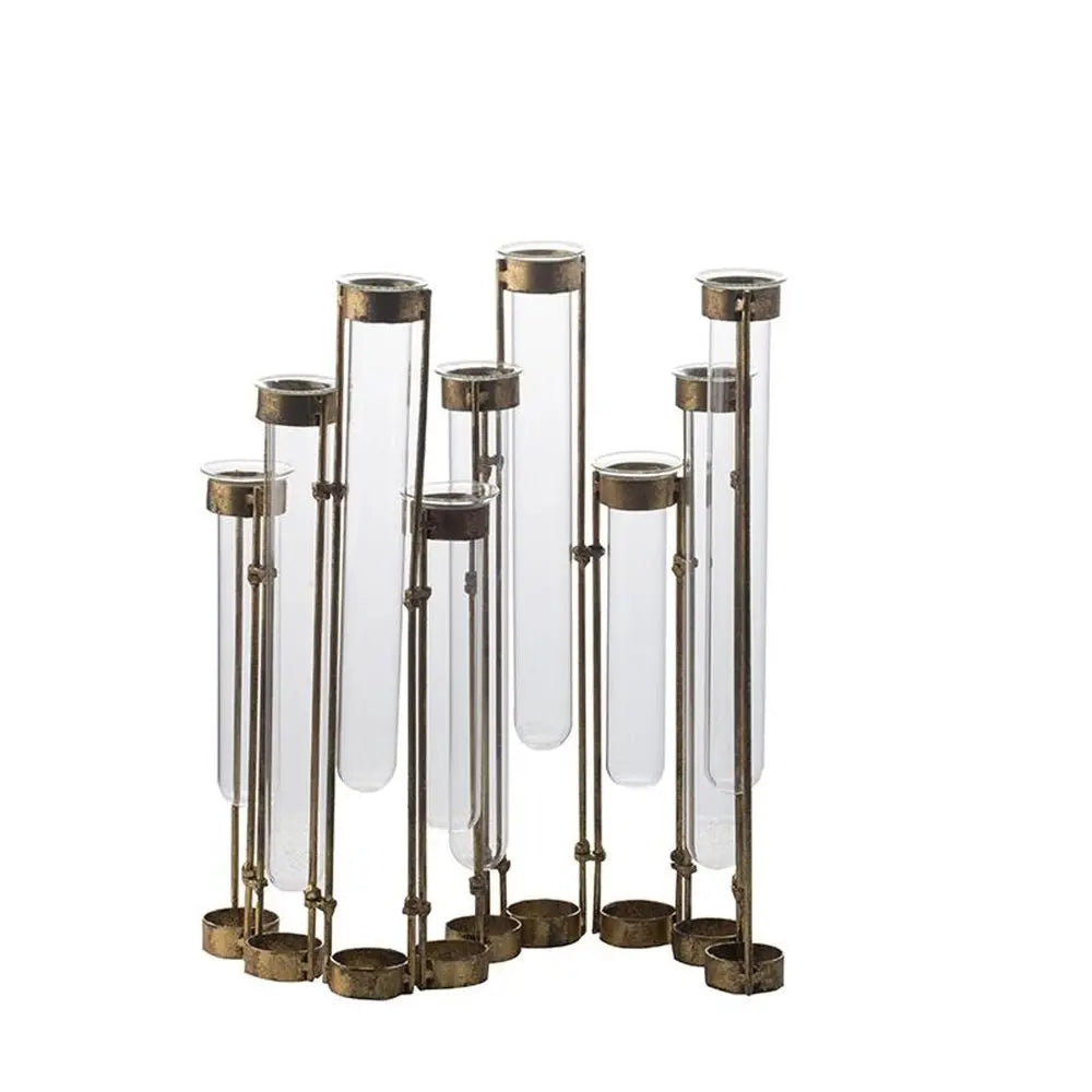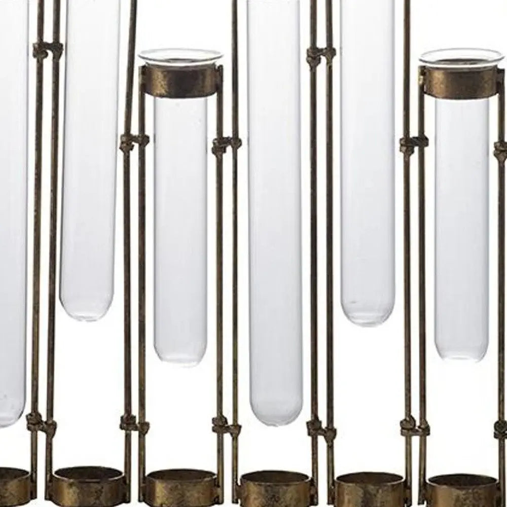 Get ready to accent your space in style with this 17-inch bronze and clear enameled cast iron and glass nine bloom table vase. This multi glass vial design adds a unique touch that makes is the perfect centerpiece for any table setting. Its unique blend of materials ensures it stands out while harmonizing with various decor styles. Ideal for displaying fresh flowers or as a decorative piece on its own, this vase will effortlessly enhance your home ambiance. Elevate your interior design with this charming addition. 13.80-inch h x 17.70-inch w x 1.80-inch d.