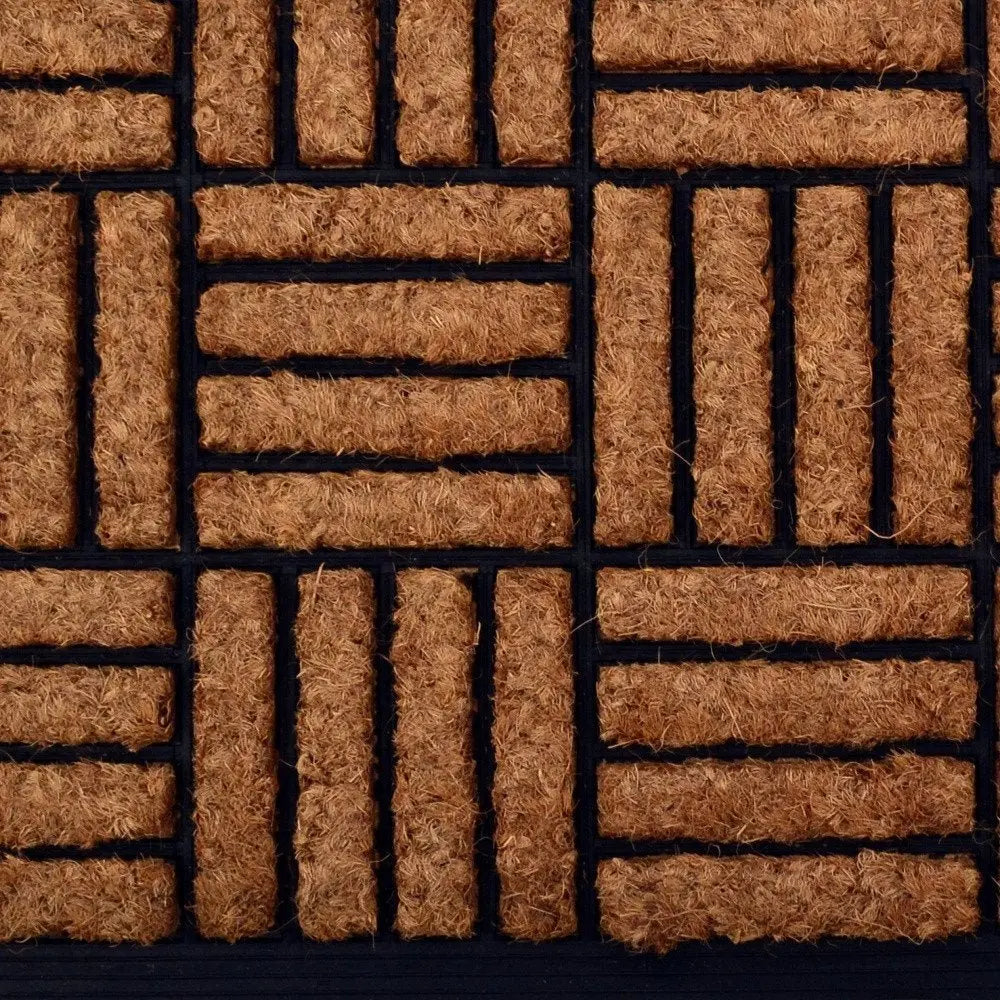 Ready to withstand heavy foot traffic, this 18-inch x 30-inch beige and black rubber and coir outdoor door mat is an ideal option for the front door or entrance way of your home or business. Crafted from rubber and coir, this mat is not only functional but is a visually appealing accessory to welcome people to your home or business. Add this decorative mat to create a practical yet inviting welcome to all who enter. 18-inch H x 30-inch W x 1-inch D