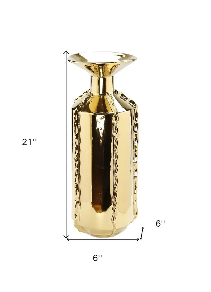 • 21" Gold Trumpet Ceramic Table Vase With Sculptural Details