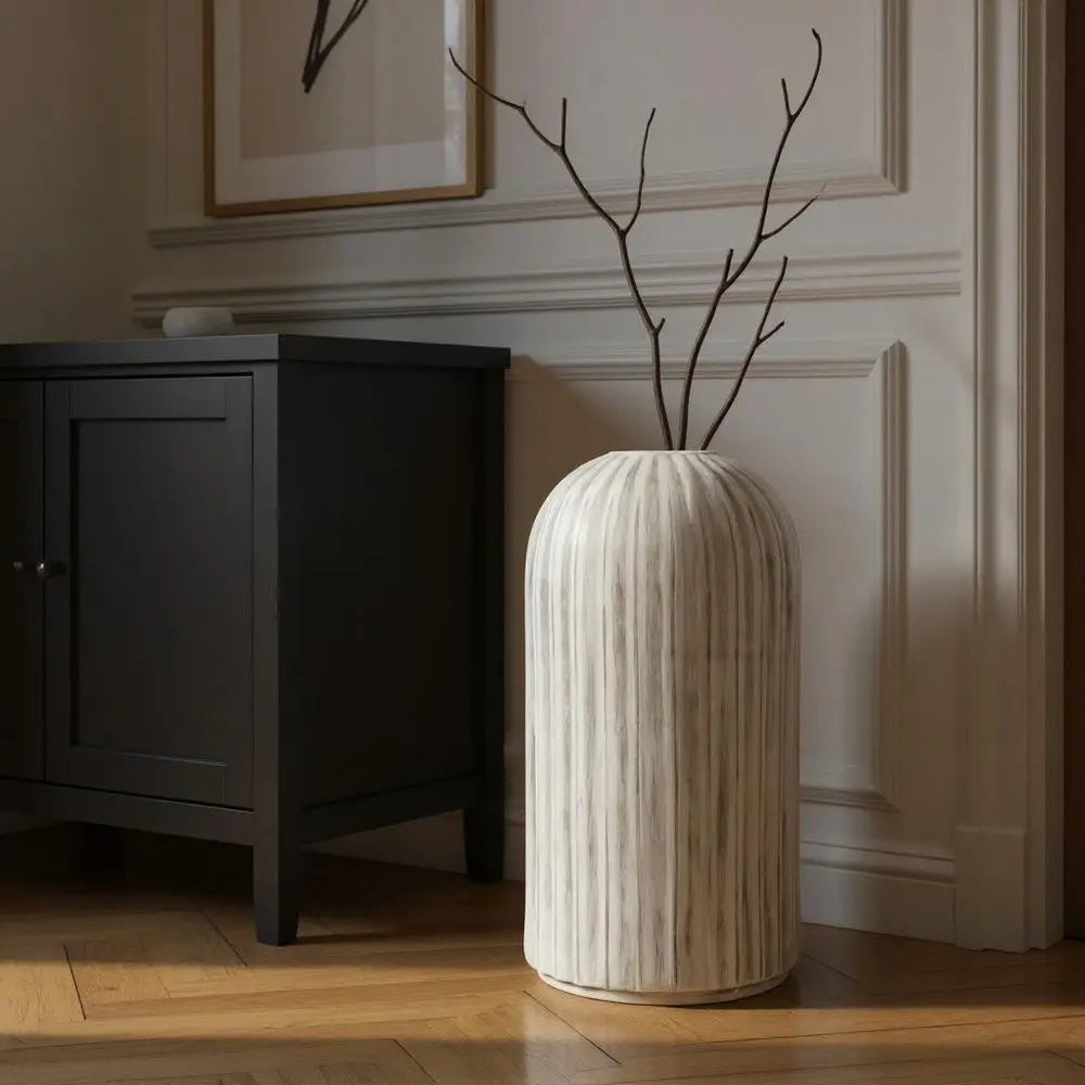 21" Gray And White Striped Cylinder Ceramic Floor Vase