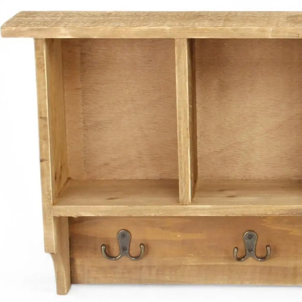 The 30-inch natural wood four hook wall mount coat rack is a perfect blend of functionality and style. This wall-mounted storage system features a top shelf, open cubby spaces, and four sturdy hooks, providing ample space for coats, hats, and bags. Its natural wood purposefully distressed finish adds a warm, rustic touch to your space. With a compact design that mounts directly on the wall, it saves valuable floor space while keeping your entryway organized. Ideal for those who appreciate both practicality and aesthetic appeal, this hanging storage center seamlessly combines utility with a charming rustic look. Organize your belongings gracefully while adding character to your home with this beautiful piece. 14.5-inch h x 29.5-inch w x 4.25-inch d.