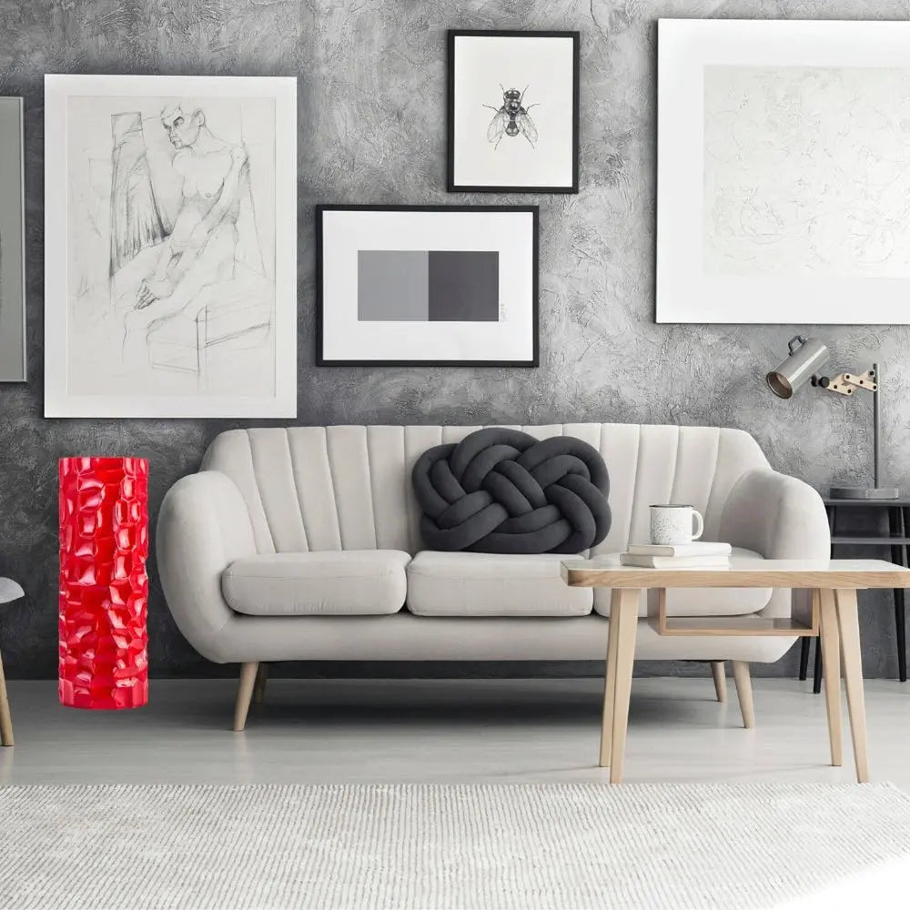 The 36-inch red geometric resin floor vase is an eye-catching piece that adds a touch of modern elegance to any space. Crafted from durable resin, this vase is designed to withstand the test of time while maintaining its vibrant color. Its geometric shape creates a striking visual effect, making it a perfect statement piece for your living room or hallway. The modern style seamlessly complements various decor themes, enhancing the overall aesthetic of your home. Whether filled with fresh flowers or displayed on its own, this floor vase is sure to become a focal point in your interior design. Elevate your home decor with this stunning and versatile vase that embodies contemporary artistry. 36-inch h x 12-inch w x 12-inch d.