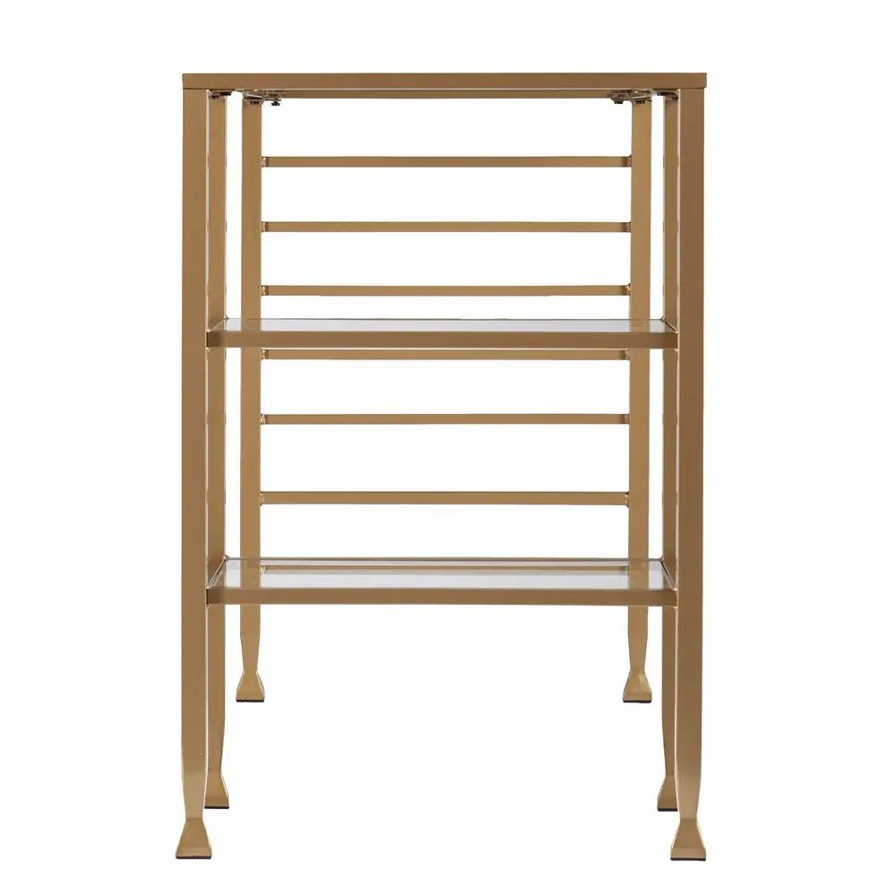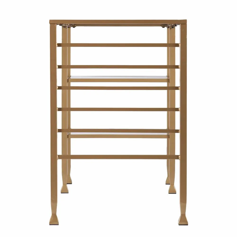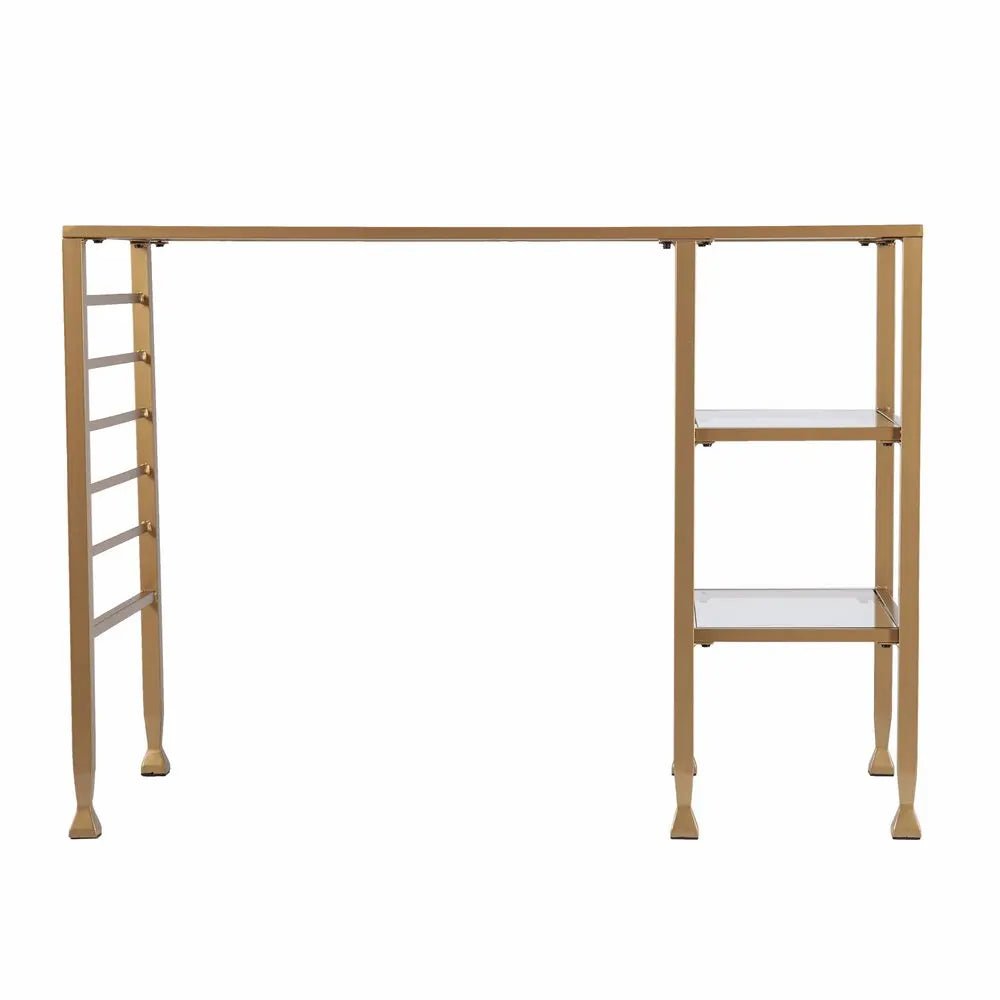 Uplift your home office with the Matt Gold and Glass Writing Desk, exclusively constructed with a sleek open form design. Pyramid feet inspired legs support the table which conveniently supports a tempered glass table top with a universal appeal. Owing to it's minimalist design, the desk is also incorporated with two fixed open shelves and six accessory rails for stress free decluttering. Complement your home with this omnipresent versatile desk. 30.25" x 42.75" x 20.75"