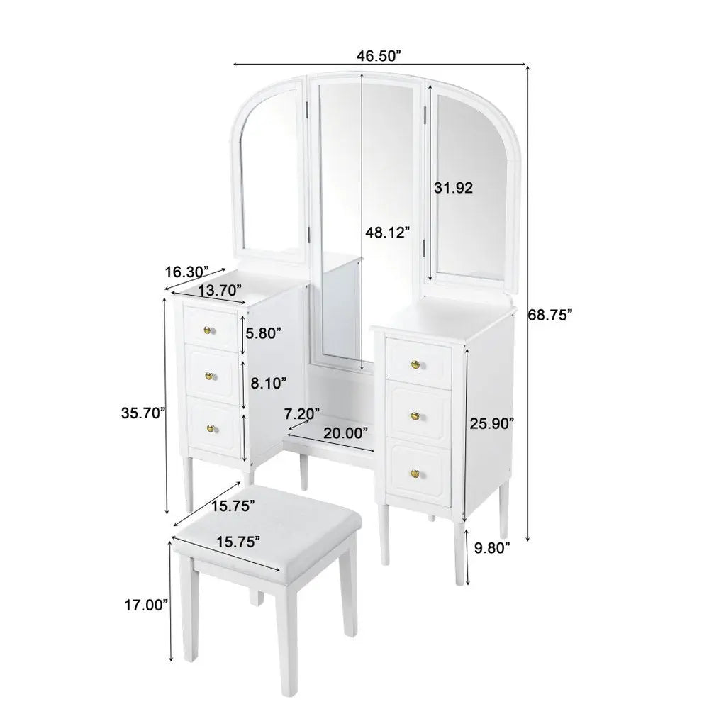 Add personality to your bedroom style and a feeling of coziness with this 47-inch white wood six drawer dresser. This vertical standard dresser has a convenient and wide top area for your getting ready needs and supplies. Loaded with capacity, this piece is equipped with six easy open drawers for practical and good looking clothing storage. The white coloration of this piece is neutral and will blend easily with most any decor. 68.75-inch h x 46.50-inch w x 16.30-inch d.