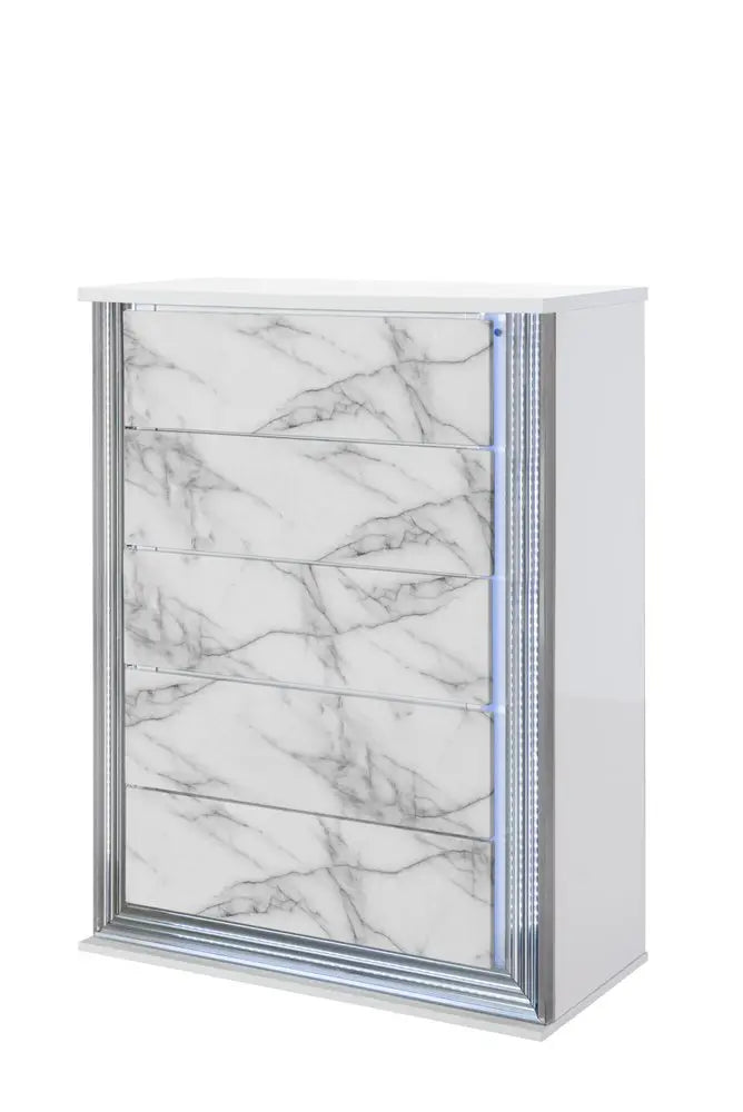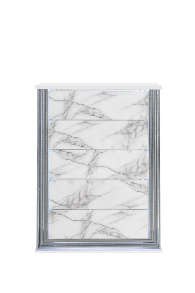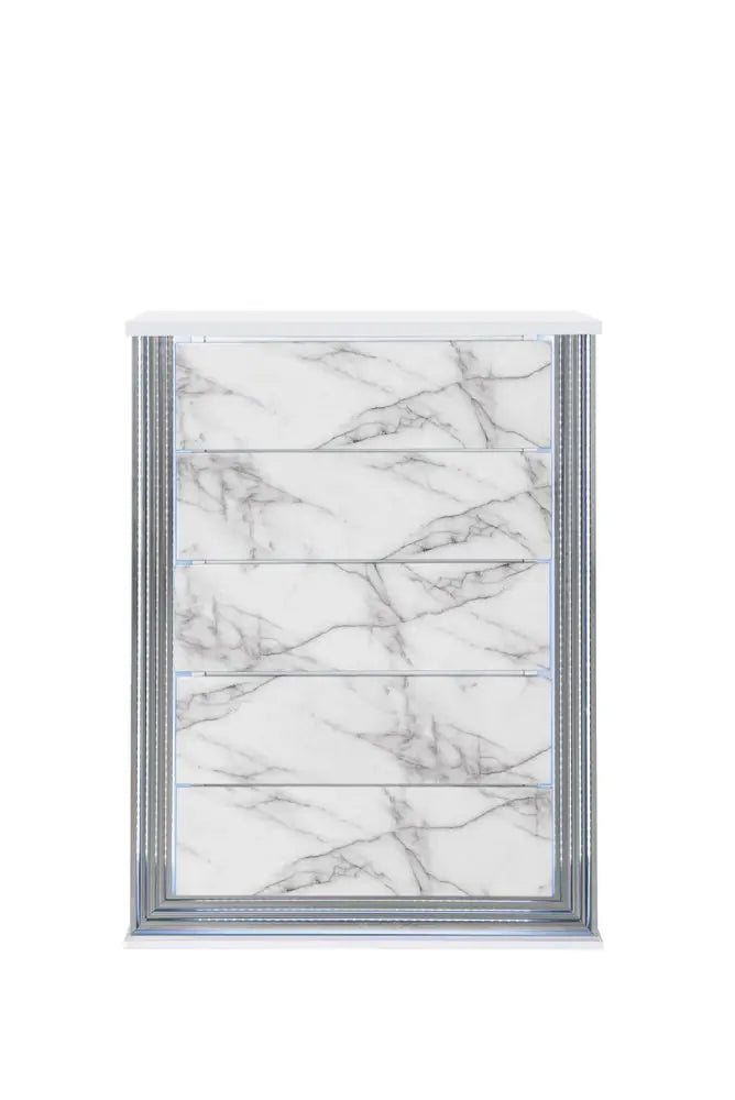 49" Silver And White Wood Faux Marble Lighted Five Drawer Dresser