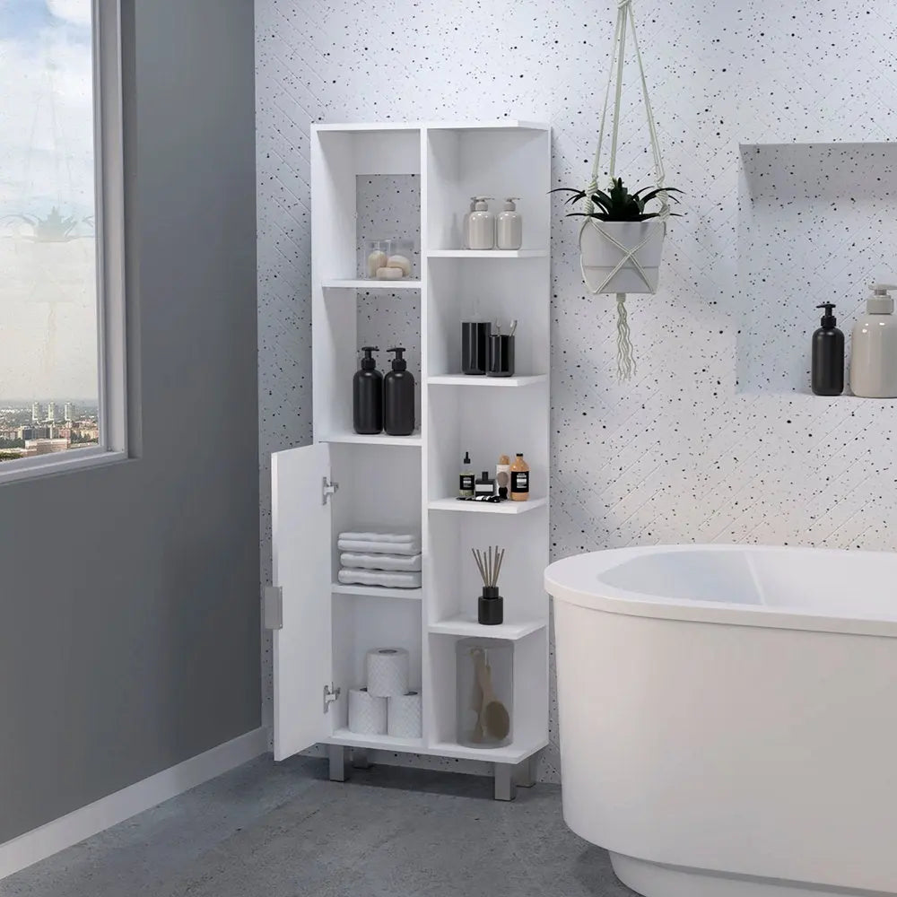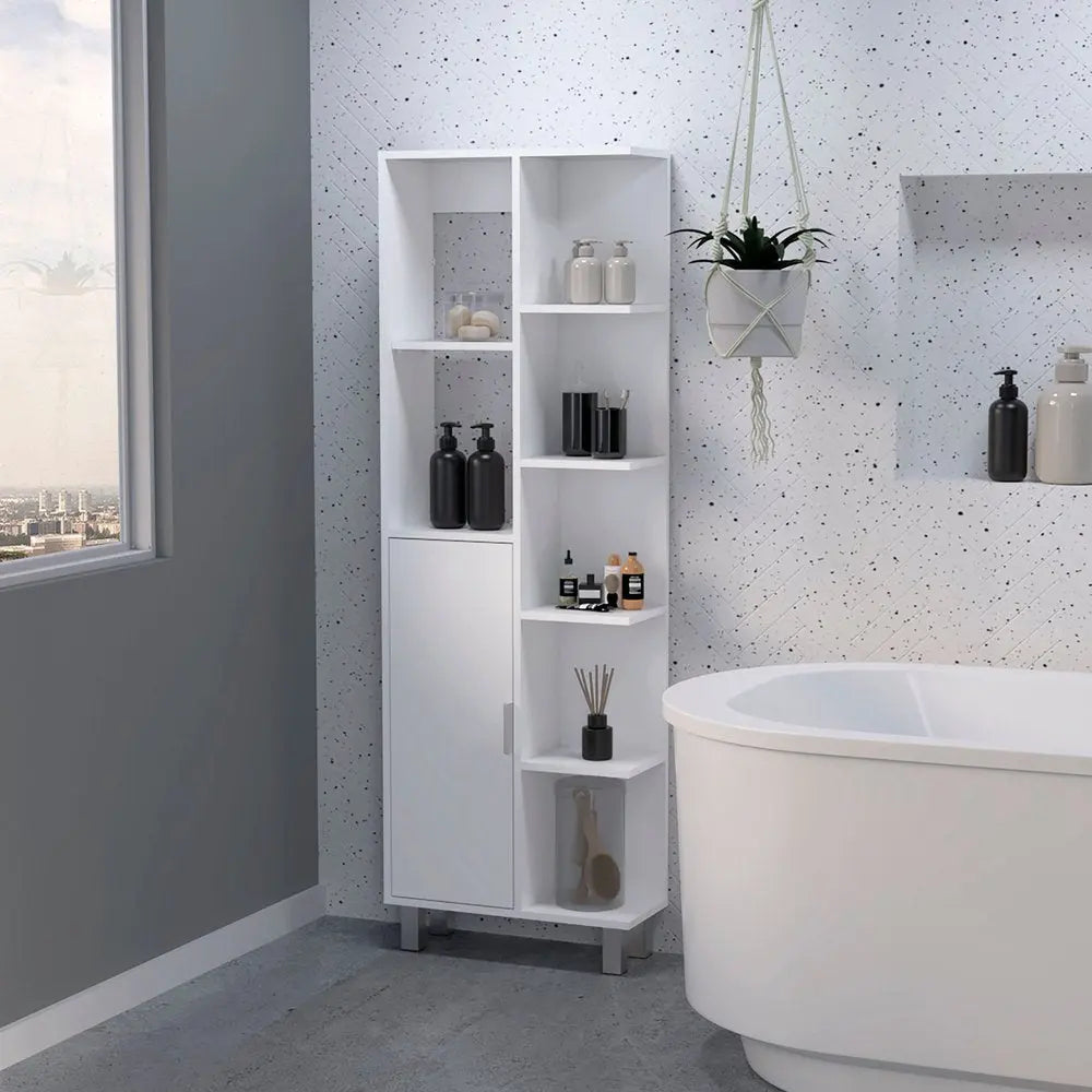 This 63-inch white wood accent cabinet with single door will be the perfect addition to your dining or living space. This beautiful accent is made from sturdy mdf that is built to last. Storage vessels can be both functional and stylish. Increase your storage space and the fashion quotient of your room with this hard wearing, versatile, and good looking cabinet. 62.99-inch h x 20.94-inch w x 8.27-inch d.