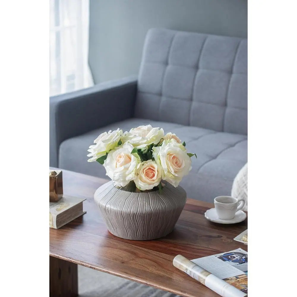 The 7-inch brown gold and gray round ceramic table vase adds a touch of elegance to your home decor. Its round shape offers a classic silhouette that complements various styles of interiors. Made from high-quality ceramic, this vase is both durable and visually appealing. With its transitional style, it effortlessly blends modern and traditional decor elements, making it a versatile piece for any room. Ideal for displaying fresh flowers or standing alone as a statement piece, this vase enhances the ambiance of your living space. The rich brown, gold, and gray tones create a sophisticated color palette that can harmonize with your existing furnishings. Elevate your home decor with this stunning table vase. 7-inch h x 11-inch w x 11-inch d.