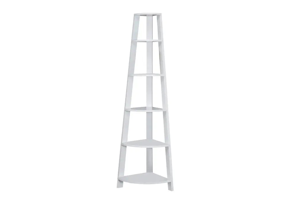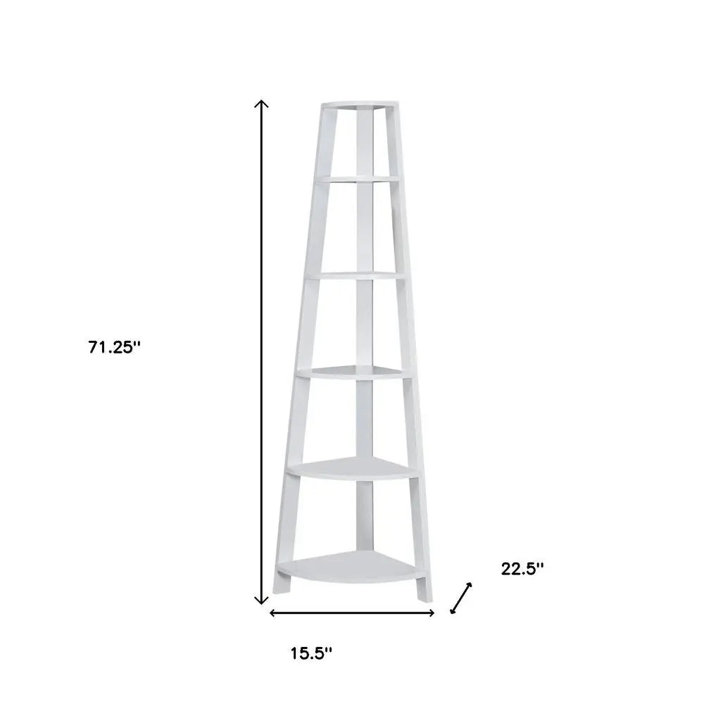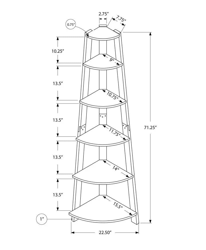 Super versatile, the 71-inch espresso wood five tier corner bookcase is an ideal piece for your living room, study, or office. 5 shelf tiers are available, providing great storage and display options for everything from books and photos to decorations. Great to use independently or pair with additional units to create a different look and add even more storage. Carefully crafted to fit in tight spaces, you can turn almost any nook into a stunning display showcase for books, plants decor and more. 71.25-inch h x 22.5-inch w x 15.5-inch d.