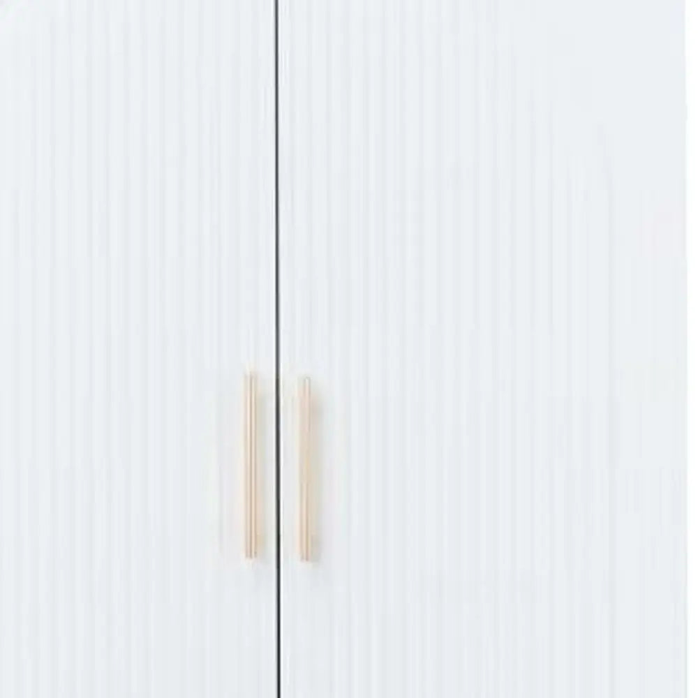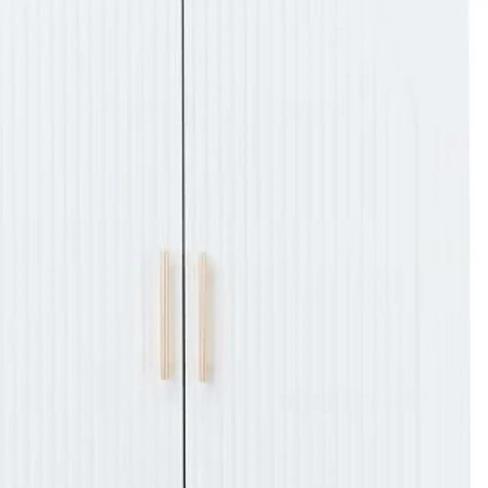 Make your room functional and visually enticing with this masterful 74-inch white carved geometric two door two drawer combo dresser. Versatile in use, this combo dresser is equipped with both drawers and doors for all your storage needs. This dresser is made from sturdy manufactured wood that is built to last. The chic white and gold coloration of this piece is neutral and will blend easily with most any decor. 74.21-inch h x 31.5-inch w x 20.39-inch d.