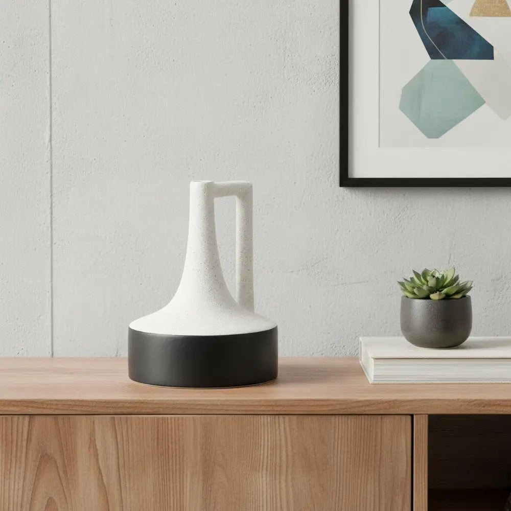 Elevate your home decor with the 8-inch black and white ombre ceramic jug vase. Crafted from high-quality ceramic, this jug vase features a modern design that seamlessly blends black and white hues, adding a contemporary touch to any space. The unique ombre effect creates a striking visual appeal, making it a standout piece for displaying your favorite flowers or greenery. The jug vase style offers a distinct shape that adds character to your interior setting, while the monochromatic color scheme enhances its versatility to complement various decor styles. Embrace the simplicity and elegance of this vase to effortlessly enhance the ambiance of your living room, bedroom, or office. 8.27-inch h x 6.1-inch w x 6.1-inch d.
