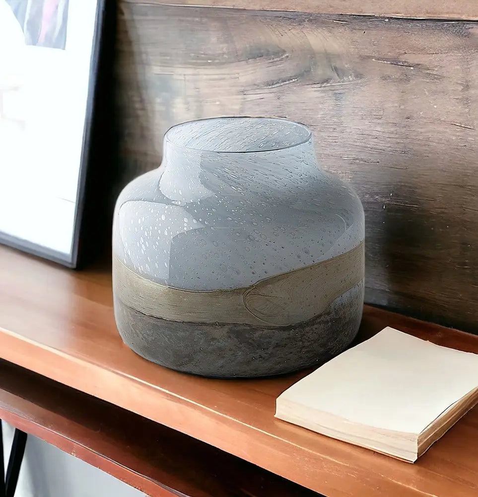 The 9-inch blue and brown seeded glass table vase is an elegant addition to any home decor. This stunning vase features a beautiful blend of calming shades of blue and brown hues in seeded glass. The unique bubble glass adds depth and character, making it an eye-catching centerpiece for your dining or living area. Ideal for displaying fresh flowers or as a standalone decorative piece, this vase effortlessly complements various interior styles and enhances your overall aesthetic. Elevate your home decor with this stylish and functional table vase designed to impress. 9-inch h x 10-inch w x 10-inch d.
