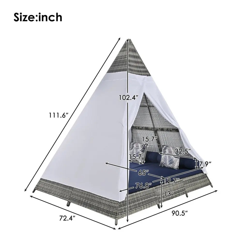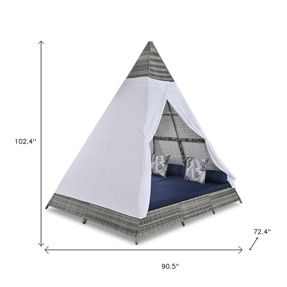 91" Brown And Blue Faux Rattan And Fabric Pyramid Lounge Chair