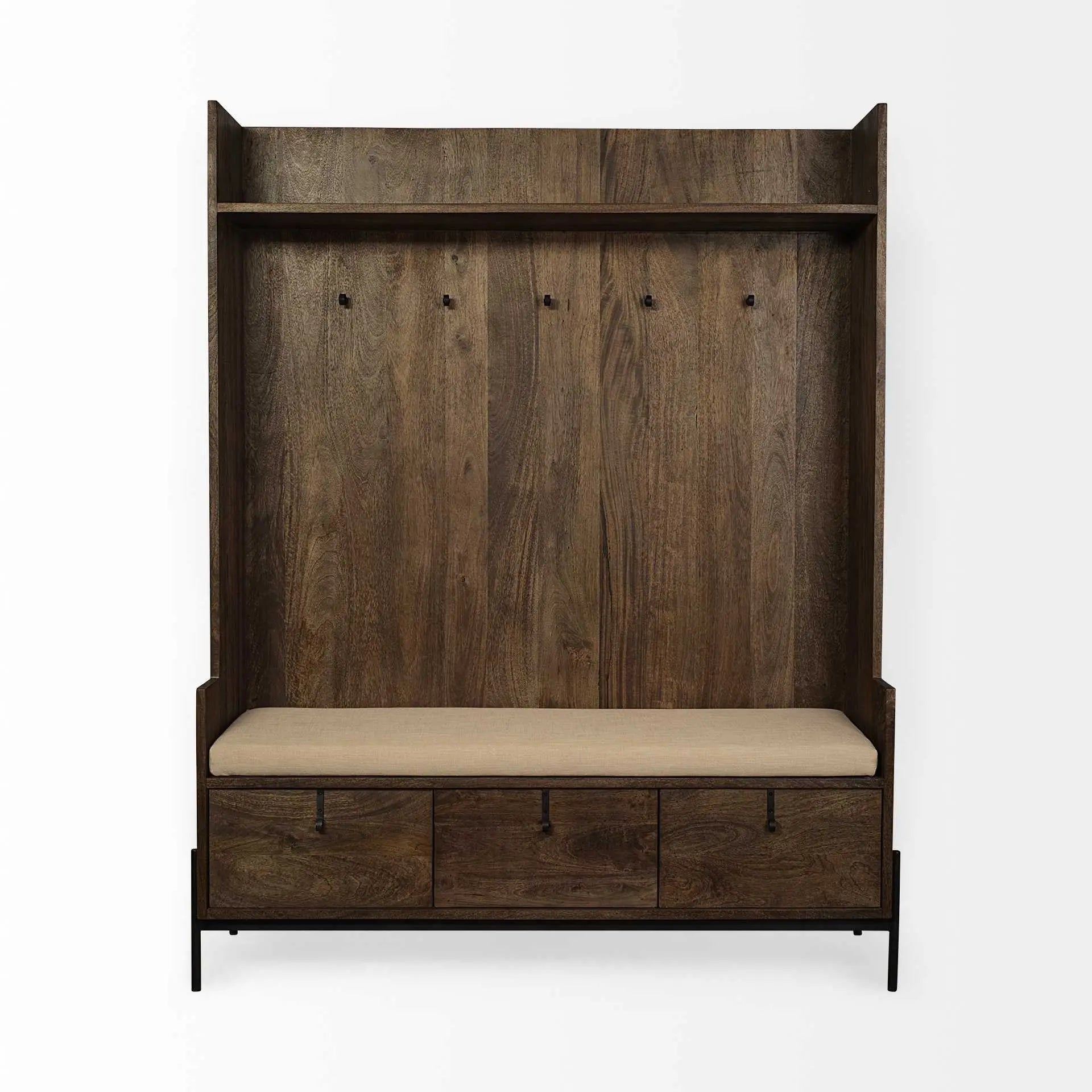 Brown Wood Cream Fabric Wrapped Seat Hall Tree With Storage
