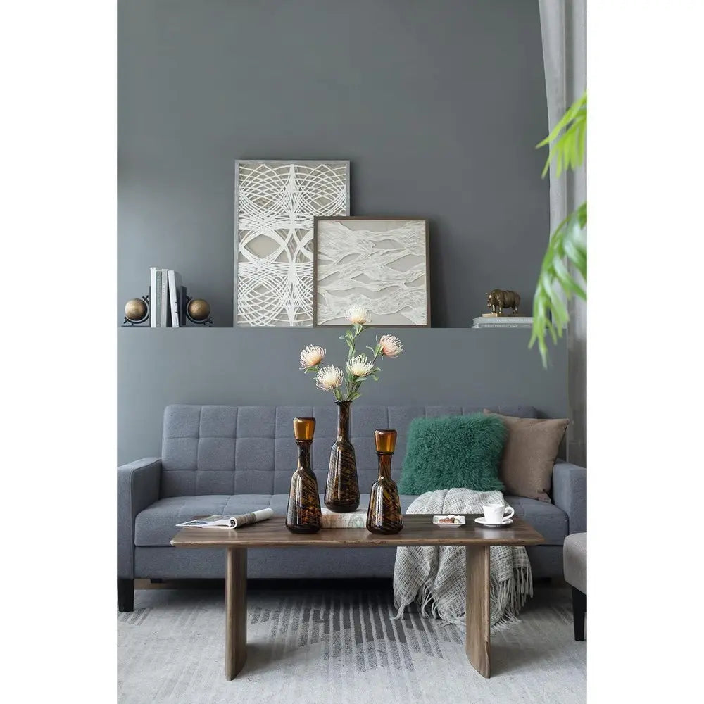 Ideal for displaying fresh or dried flowers, it effortlessly elevates your home ambiance. This set of three decorative bottles in a sleek cylindrical shape adds a modern touch to any decor style. Crafted from high-quality art glass that features a mix of amber and swirling dark brown hues, each piece showcases a stunning look. Whether arranged together or separately, these bottles make a stylish statement that complements any room in your home. Their versatile design allows them to blend seamlessly with various interior aesthetics. 18.10-inch h x 14.70-inch w x 4.90-inch d.