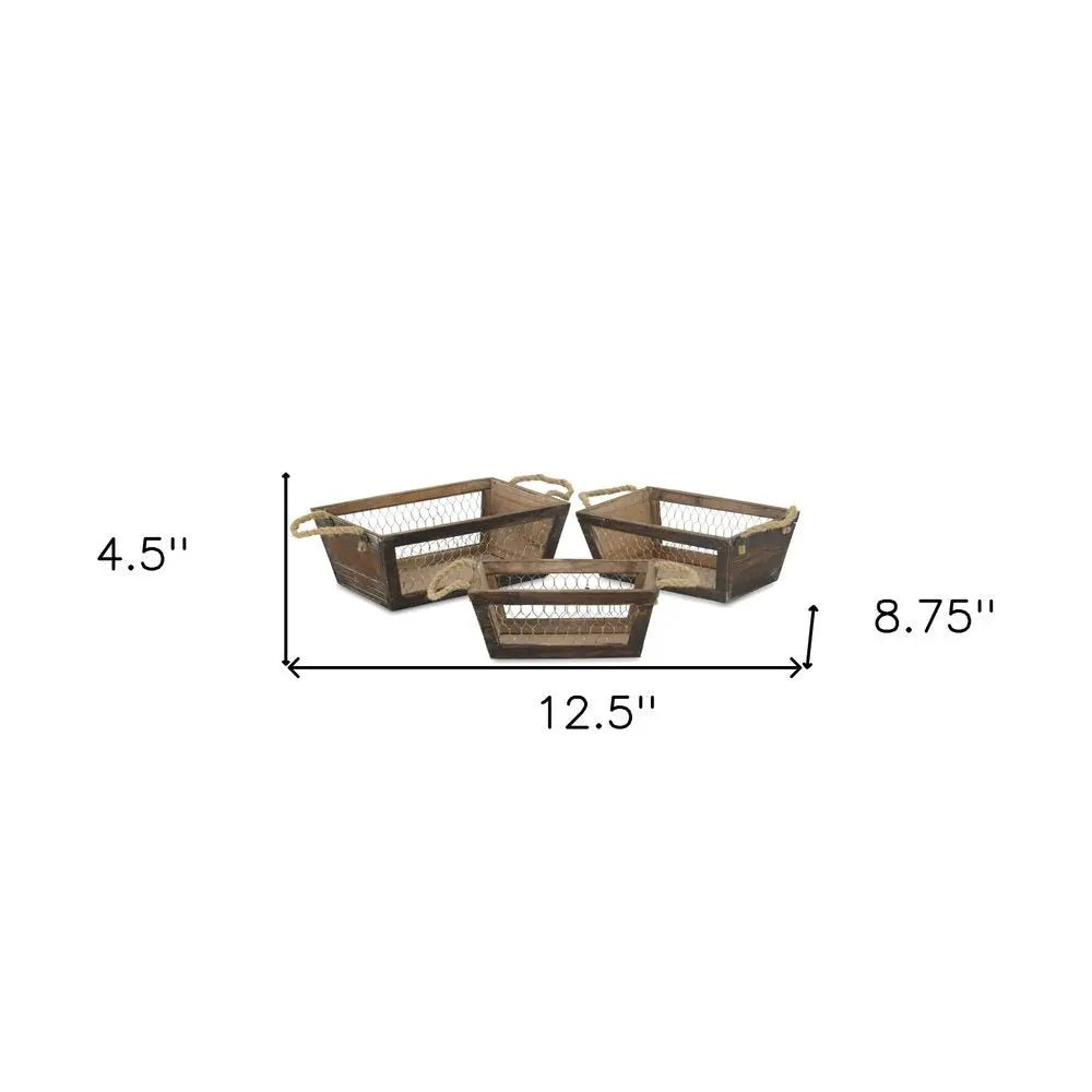 The set of three dark brown solid wood and metal crate is perfect for bringing organization and style to your home. This organizer includes three uniquely sized crates, allowing for versatile storage options tailored to your needs. Crafted from solid wood and metal, it promises durability while adding a rustic charm to any room. The rectangular shape of each crate makes them easy to stack or arrange in various configurations. With a cottage style and a rich dark brown color, these crates blend seamlessly with diverse decor themes. Enhance your living space while keeping it tidy with these functional and aesthetically pleasing organizers. Perfect for storing books, toys, or household items, they will elevate your home organization game. 4.50-inch h x 12.50-inch w x 8.75-inch d.