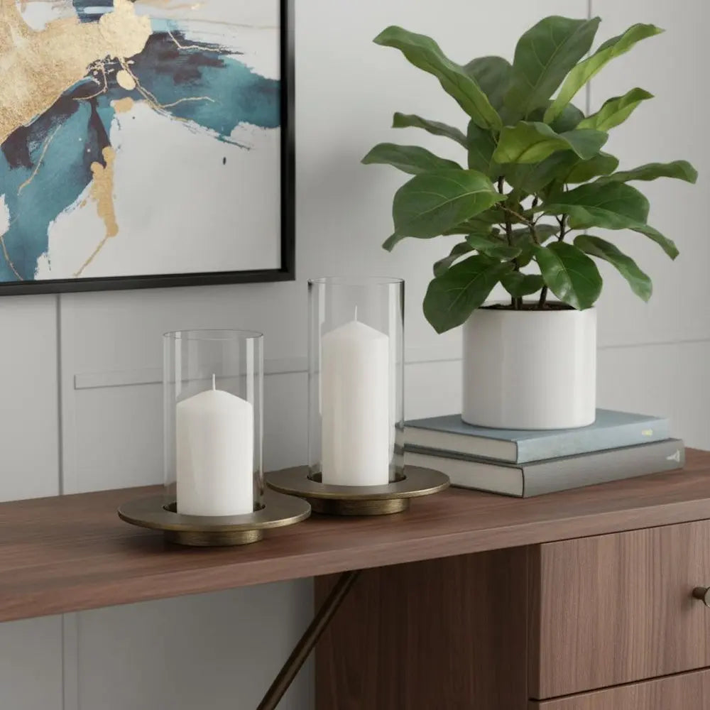 Set of Two Gold Distressed Geometric Metal Tabletop Hurricane Candle Holders