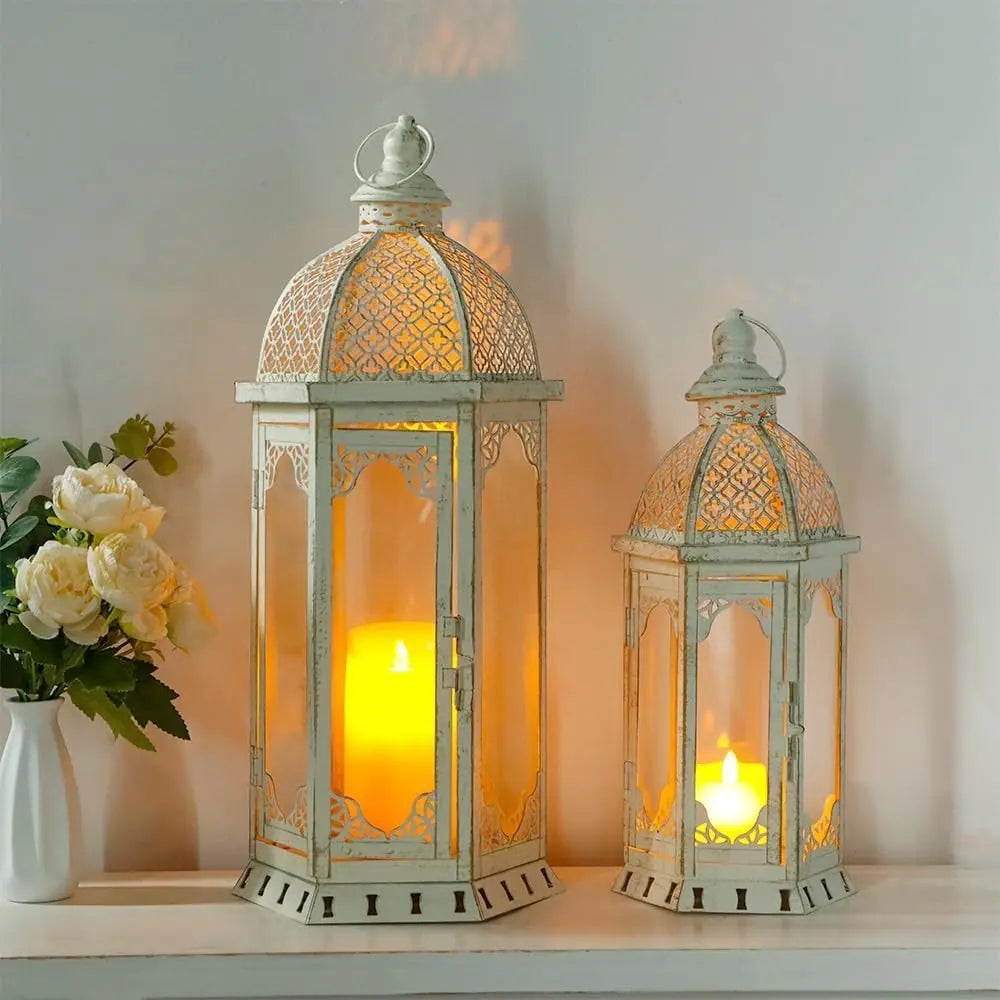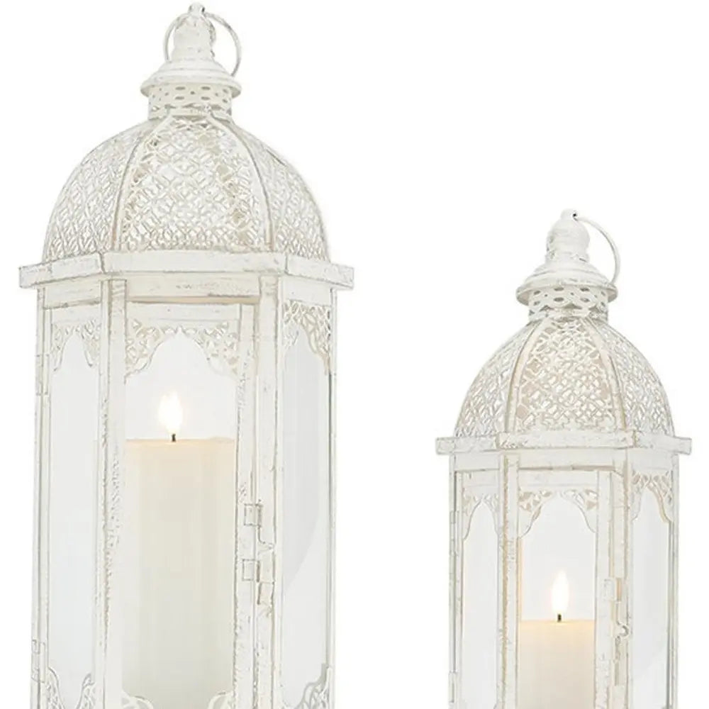 Set of Two White Distressed Ornate Metal Tabletop Lantern Candle Holders - NOVA HOME FURNITURE